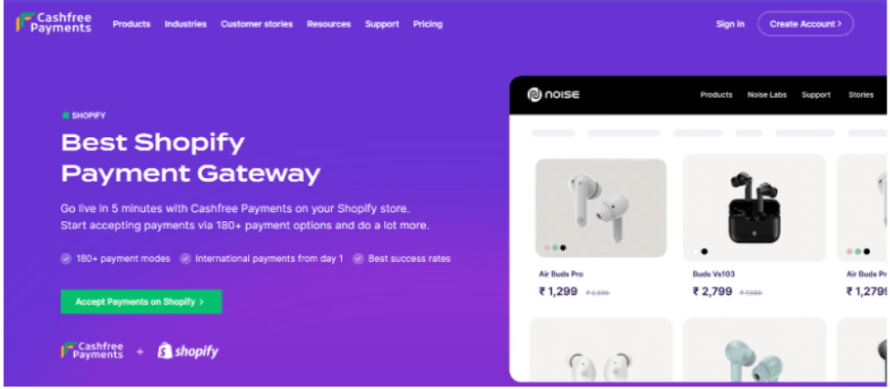 Cashfree Payments is a renowned payment gateway in India that accepts payment via 180+ options. It is known for its easy integration with Shopify and fast settlement process. The feature-rich dashboard is great for accepting orders and collecting payments.